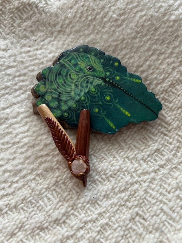 Hummingbird Pipe by Betson Macawashi, Hand Carved Palo Sangre Wood Tobacco Pipe for Shamanic Ceremony. Painted by Franz Joao Rengifo an ayahuasca visionary. Made in Pucallpa, Peru